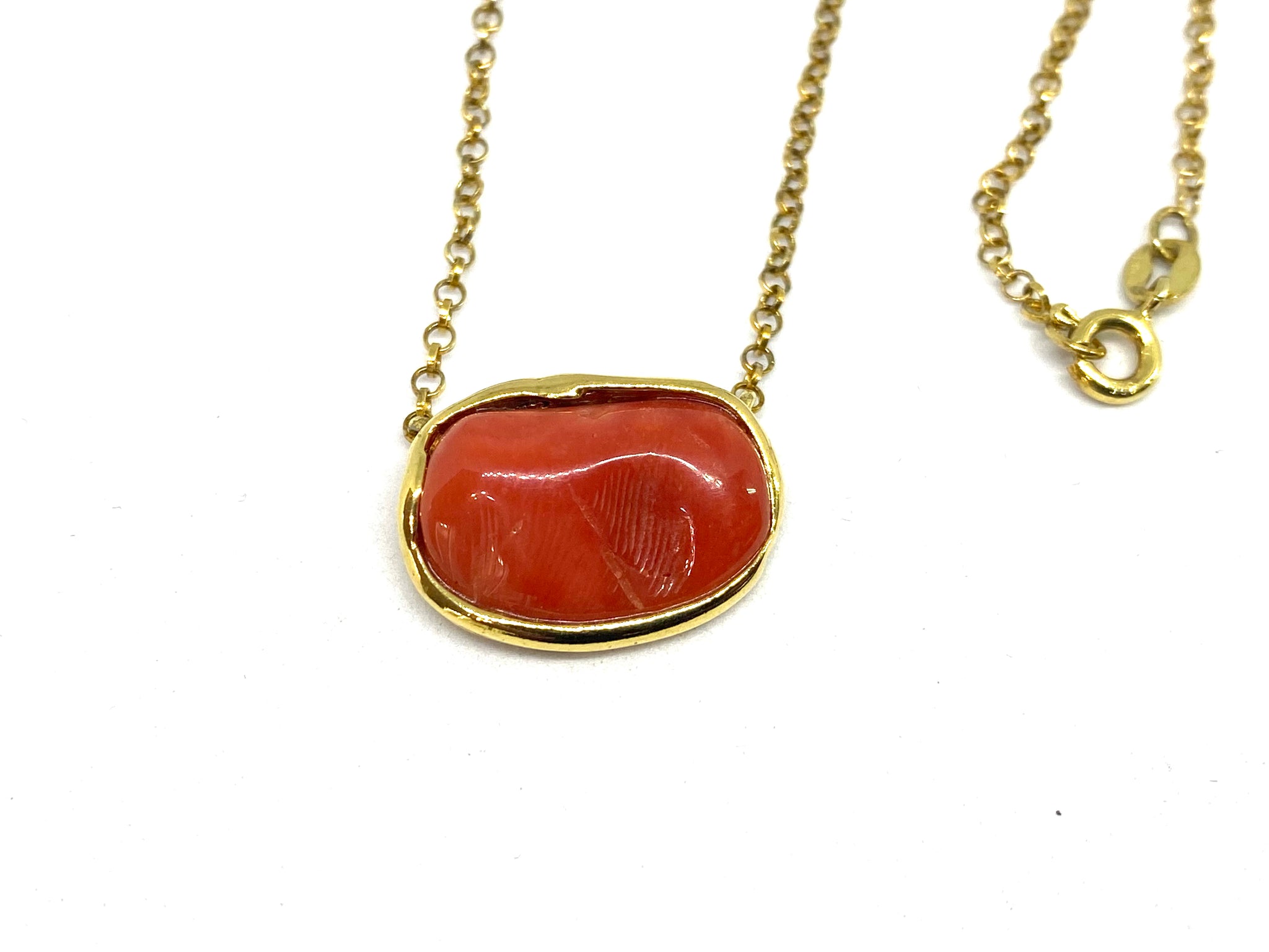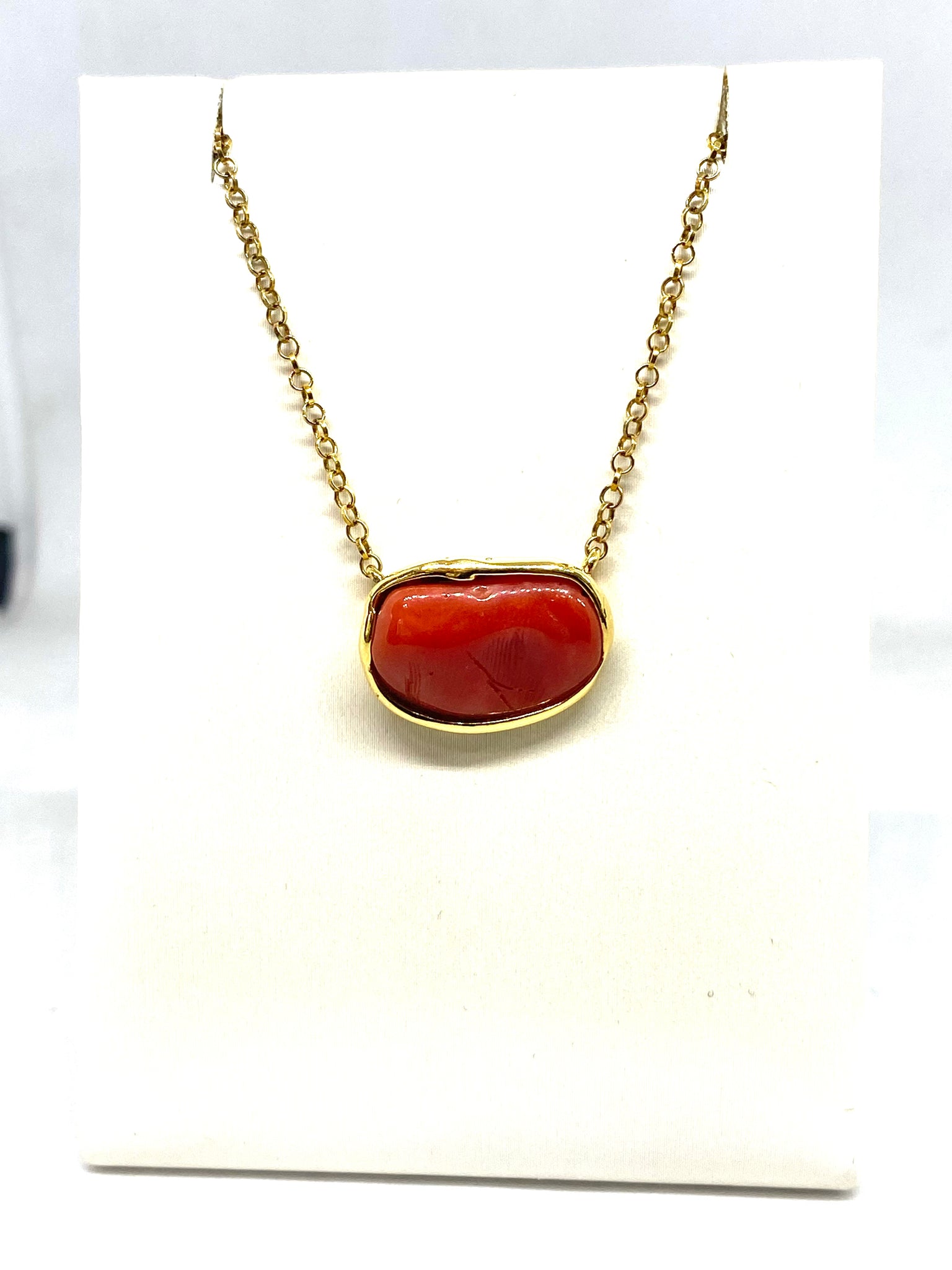 Collana in Argento, placcata in oro 18kt, con Corallo rosso naturale. La lungheza della collana è di cm45. La montatura è realizzata interamente a mano.