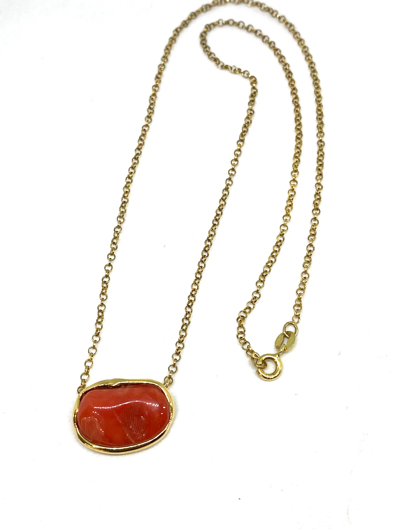 Sterling silver necklace, plated in 18kt gold, with natural red mediterranean Coral. The total lenght is cm45 (17,5 inches). The frame is totally handmade.